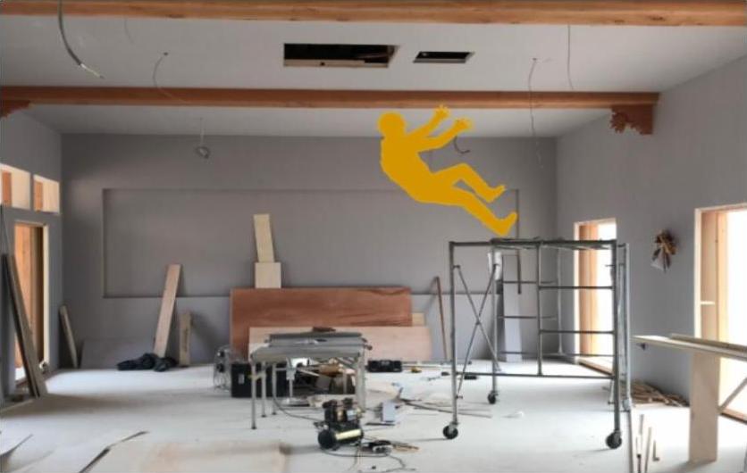 ![]() | 예방대책 ● 이동식비계의 최상부에 안전난간을 설치하고 사용합니다. ● 추락의 위험이 있는 장소에서 작업을 하는 근로자에게 안전모를 지급하고 착용하도록 관리·감독합니다. |