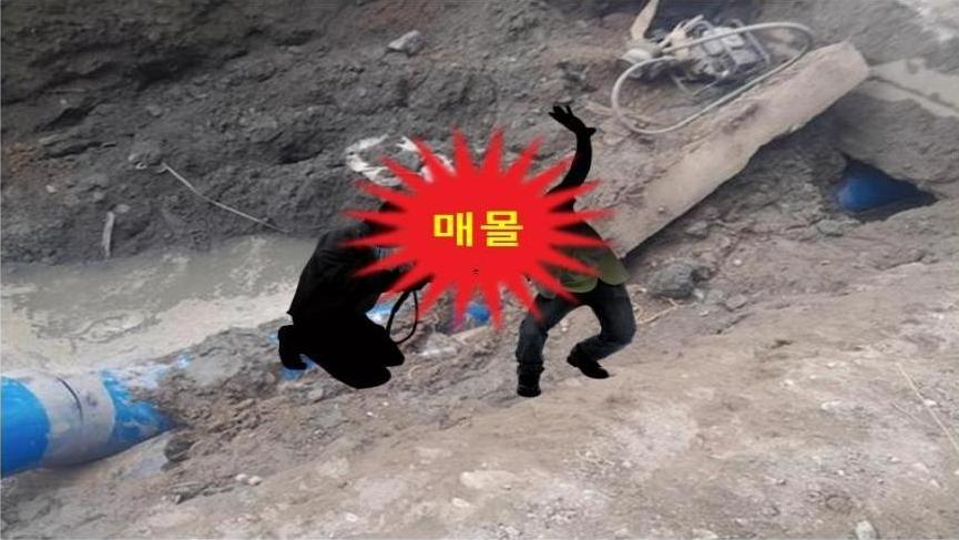 '23년 9월 11일(월) 10:40경 경기도 의왕시 소재 ○○천 송수관 이설공사 현장에서 송수관 연결 매몰 부위 용접 작업 중 토사와 구조물에 되어 2명 사망