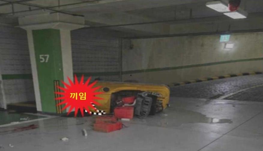 '23년 8월 14일(월) 08:17 서울시 소재 아파트 지하주차장에서 탑승식 청소차로 주차장 바닥 청소 중 경사로에서 청소차가 전도되며 재해자가 기둥 사이에 끼여 사망