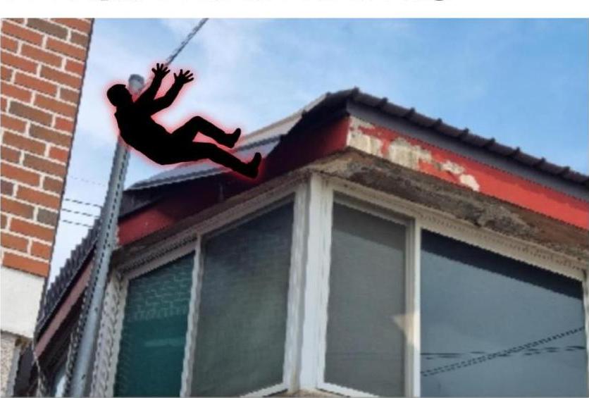 ![]() | 예방대책 ● 지붕 위에서 작업을 하는 경우 지붕의 가장자리에 안전난간을 설치하거나, 근로자가 안전대 부착 설비에 안전대를 걸고 작업을 하도록 관리합니다. |