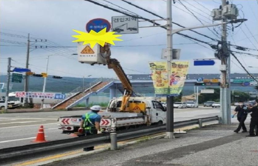 2023년 7월 29일 10:10 경 경기 이천시 소재 도로에서 고소작업차 작업대에서 통신케이블 정리 작업 중이던 재해자가 표지판에 부딪혀 4m 아래 바닥으로 떨어져 사망