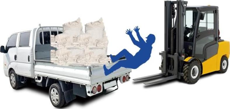 2023년 7월 3일 14:48경 전북 정읍시 소재 양곡 창고에서 재해자가 화물차에 올라가 지게차 포크에 화물 고리를 걸어주는 작업 중 2m 아래 바닥으로 떨어져 치료 중 7월 13일 사망