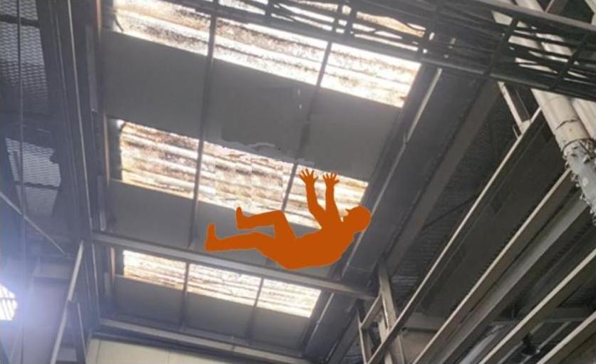 ![]() | 예방대책 ● 지붕 작업 시 채광창(skylight)에는 견고한 구조의 덮개를 설치 하거나 추락방호망을 설치합니다. ● 근로자가 안전대를 착용 후 안전대 부착설비에 연결하도록 합니다. |