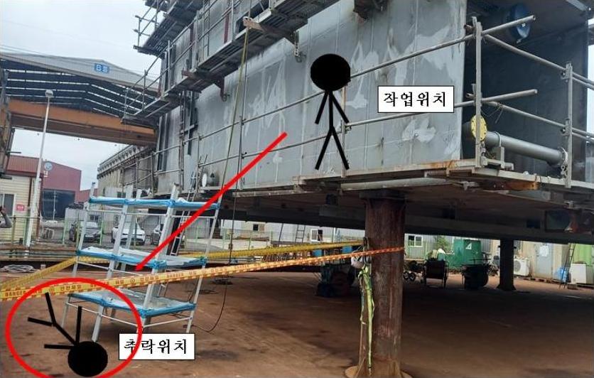 2023년 7월 3일 11:08경 전남 영암군 소재 조선소에서 선박블럭 적재 선반 해체 작업 중 추락(약2.2m)하여 치료 중 7월 5일 사망