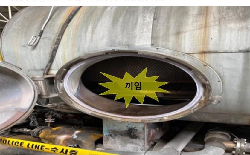 2023년 7월 5일 23:55경 대구 서구 소재 염색공장에서 정련기* 내부에 있는 원단을 꺼내던 중 동료 작업자가 정련기를 가동하여 정련기 프레임과 회전통 사이에 끼여 병원에서 치료 중 7월 6일 사망 *정련기: 섬유 제품에 섞인 불순물을 처리하는 기계