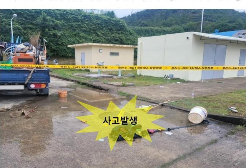 2023년 7월 7일 20:37경 전남 화순군 소재 정수장에서 재해자가 맨홀 아래 설치된 유량계실 에서 누수가 발생한 배관을 교체하던 중 쓰러져 사망 * 구조하기 위해 맨홀 아래로 내려간 작업자 2명도 쓰러져 치료 중