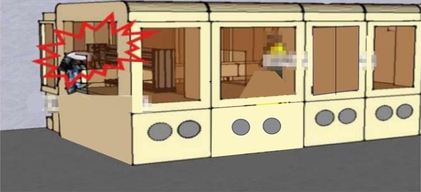 ![]() | 예방대책 ● 살미기에 출입한글 살시킨 경우 출입 개시 살미가 자동정지 하도록 하는 안전장치(인터록, 안전플러그 등)를 설치하고, 항상 무효화 되지 않도록 철저하게 관리 합니다. |