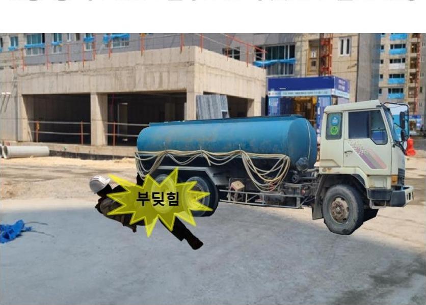 2023년 6월 15일 07:32경 충북 청주시 소재 아파트 공사현장에서 재해자가 화장실을 가기 위해 이동 중 후진하던 살수차에 부딪히며 깔려 사망