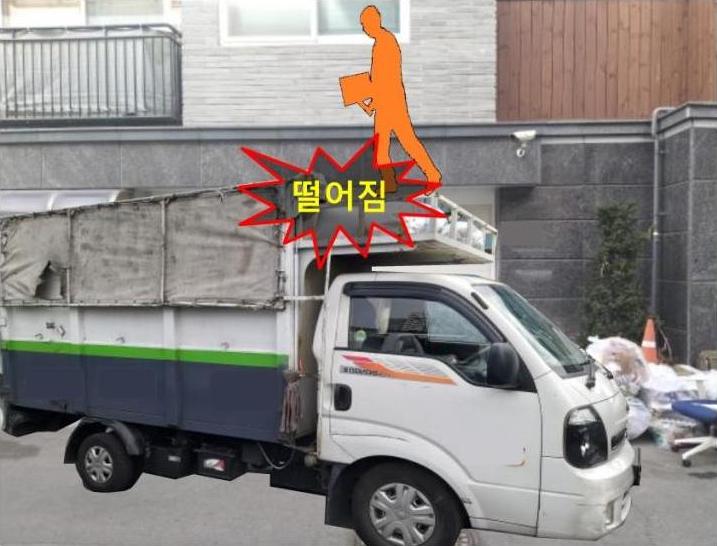 2023년 3월 6일 18:10경 서울 성북구 빌라 주차장에서 재활용쓰레기 수거를 화물차 위에 올라가 작업 중 2.5m 아래 으로 떨어져 치료 중 5월 31일 사망 소재 위해 바닥