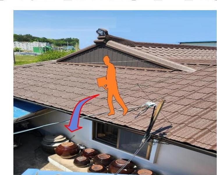 2023년 5월 7일 15:15경 경북 울진군 소재 개인주택 지붕 위에서 기와 설치 작업 후 이동 중 바닥으로 떨어져 치료 중 5월 17일 사망