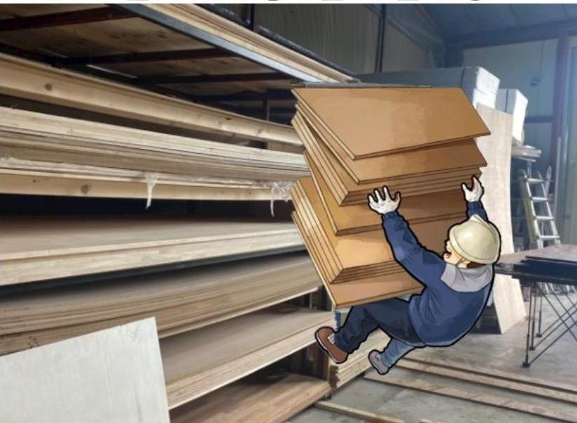 ![]() | 예방대책 ● 제품, 자재, 부재 등이 넘어지지 않도록 붙들어 지탱하게 하는 등 안전 조치를 취하거나, 근로자가 접근하지 못하도록 합니다. |