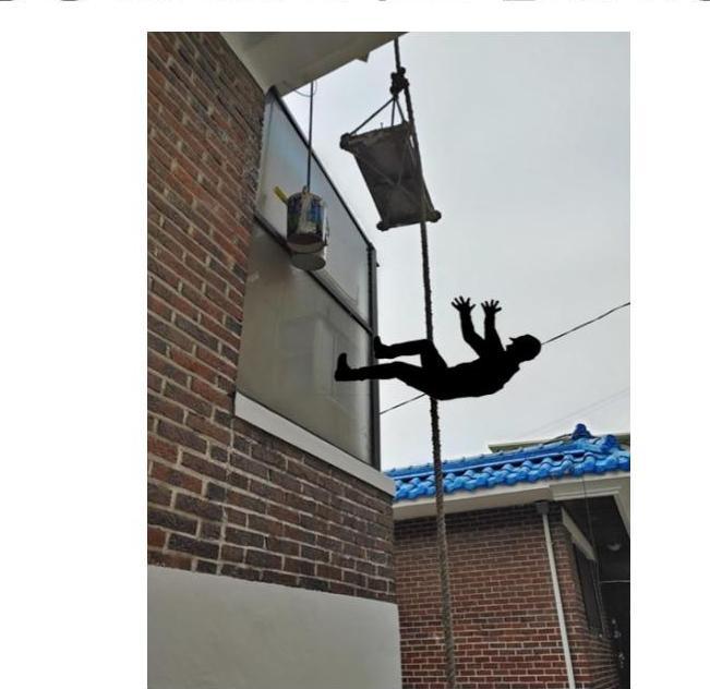 ![]() | 예방대책 ● 구명줄을 설치하고 구명줄에 안전줄을 체결하도록 합니다. ● 달비계 작업대의 4개 모서리에 로프를 매달아 작업대가 뒤집히지 않도록 합니다. |