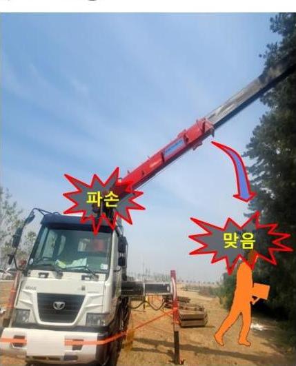 2023년 5월 10일 08:57경 인천 중구 소재 업무지역 기반시설 공사현장에서 공원 내 정자 설치를 위해 크레인으로 자재 인양 중 붐대 연결부(힌지)가 파손되며 떨어지는 붐대에 인근의 작업자가 맞아 사망