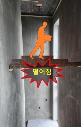 ![]() | 예방대책 ● 로자가 추락하거나 넘어질 위험이 있는 장소에서 작업을 할 때에는 작업발판을 설치한 후 작업을 실시합니다. ● 작업발판은 하중을 견딜 수 있도록 견고한 것으로 설치합니다. |