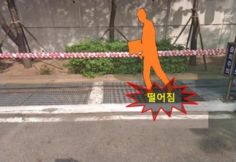 ![]() | 예방대책 ● 개구부에 덮개 등을 설치한 경우에는 뒤집히거나 떨어지지 않도록 설치합니다. ● 추락의 위험이 있는 장소에는 관계 근로자 외 출입을 금지합니다. |