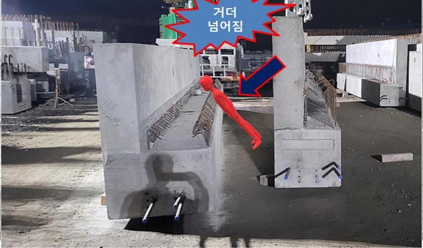 2023년 4월 11일 19:26경 충북 괴산군 소재 콘크리트 구조물 제작 공장에서 PC제품* 사이 에서 보수작업을 하던 재해자가 쓰러지는 PC 제품에 깔려 사망