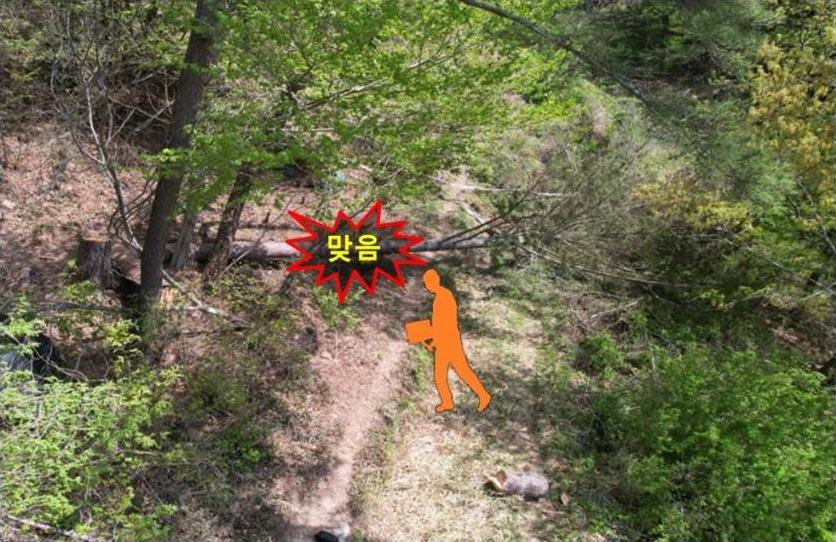 ![]() | 예방대책 ● 수구(베어지는 쪽의 밑동 부근에 만드는 절단면을 30도 이상으로 만듭니다. ● 벌목하려는 나무로부터 해당 나무 높이의 2배에 해당하는 직선거리 안에서 다른 작업을 하지 않도록 관리합니다. |