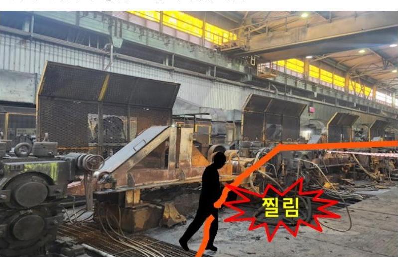 2023년 3월 31일 02:12경 충남 당진시 소재 철근 제조 공장 압연공정에서 압연기의 압연롤 사이에 선재*가 걸려 압연기 밖으로 나와 재해자의 대퇴부를 관통하여 병원으로 이송하였으나 사망 * 선재: 단면이 둥근 모양의 철강제품