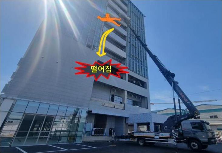 2023년 4월 3일 11:00경 부산 사상구 소재 사옥 신축 공사현장에서 건물 9층 외벽 마감 작업 후 고소작업대로 내려오던 중 8층 높이에서 떨어져(36m) 사망