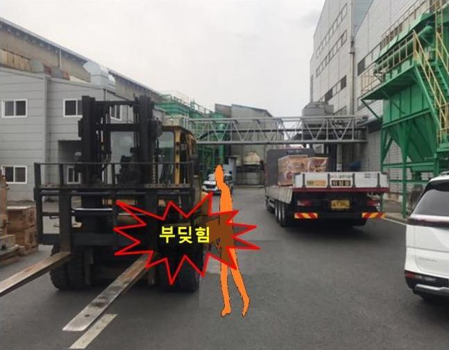 2023년 4월 4일 15:30경 충남 천안시 소재 산업기계부품 제조 공장 상·하차장에서 화물차 운전원이 화물 하역을 위해 대기하던 중 지게차에 부딪혀 사망