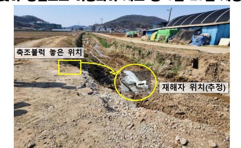 2023년 3월 23일 08:00경 경기 화성시 소재 하천 제방 보수 공사현장에서 제방 축조블록을 쌓던 중 축조블록이 굴러 떨어져 하천 바닥 에서 양수작업 중이던 재해자가 축조블록에 막아 병원으로 이스되어 치료 중 3월 25일 사망