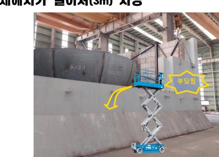 2023년 3월 18일 09:32경 전북 군산시 소재 방사선 비파괴검사장에서 콘크리트 블럭 조립 작업 중 크레인으로 인양 중인 콘크리트 블럭과 고소작업대가 부딪혀 쓰러졌고 고소작업대에서 재해자가 떨어져(3m) 사망