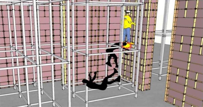 ![]() | 예방대책 ● 근로자에게 만드시 안전대를 작용 시켜 동바리에서 작업이나 승하강(이동시 수평연결재에 체결하도록 관리감독을 철저히 하고 승하강용트랩 (시다)를 설치하여 안전하게 승하강할 수 있도록 합니다. |